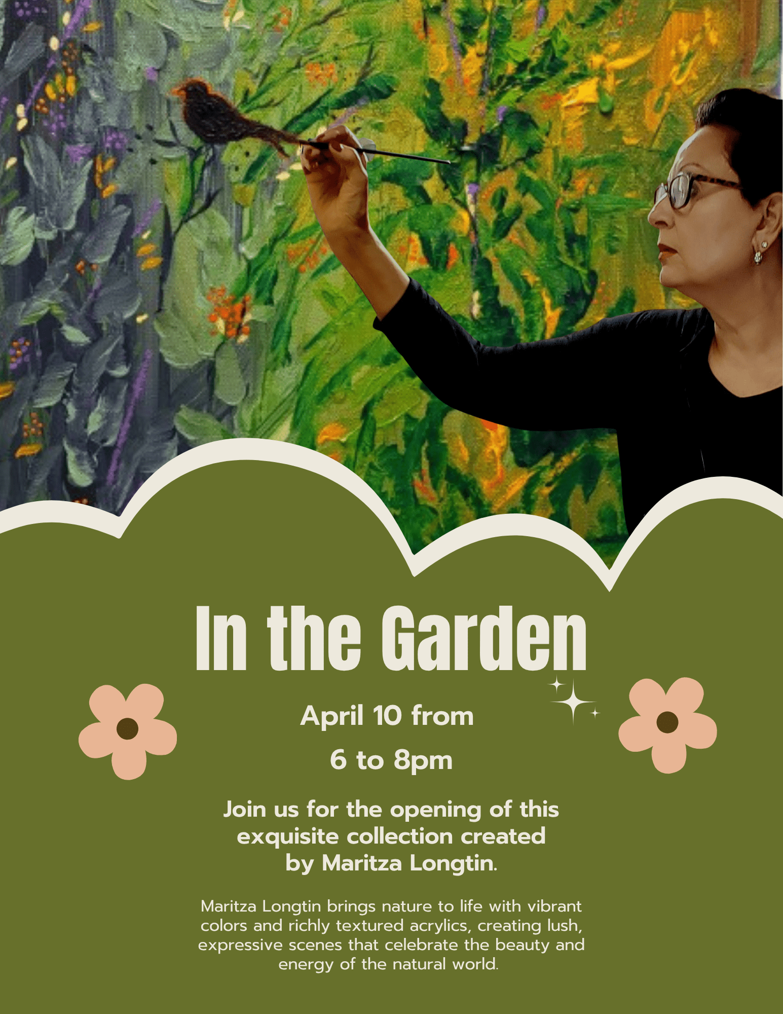 Step into a world where color grows wild. In In the Garden, Maritza Longtin captures the lush energy of nature through vibrant, expressive paintings created with thick layers of acrylic paint. Her bold brushwork and rich textures bring gardens, foliage, and quiet moments with nature to life, inviting viewers to slow down and look closer.