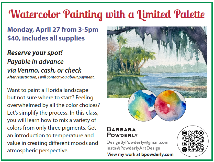 Want to paint a Florida landscape but not sure where to start? Feeling overwhelmed by all the color choices? Let’s simplify the process. In this class, you will learn how to mix a variety of colors from only three pigments. Get an introduction to temperature and value in creating different moods and atmospheric perspective.